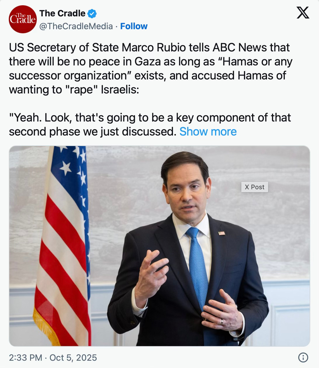 Le secrĂ©taire dâĂtat amĂ©ricain Marco Rubio a Ă©galement appelĂ© Ă dĂ©manteler le Hamas.