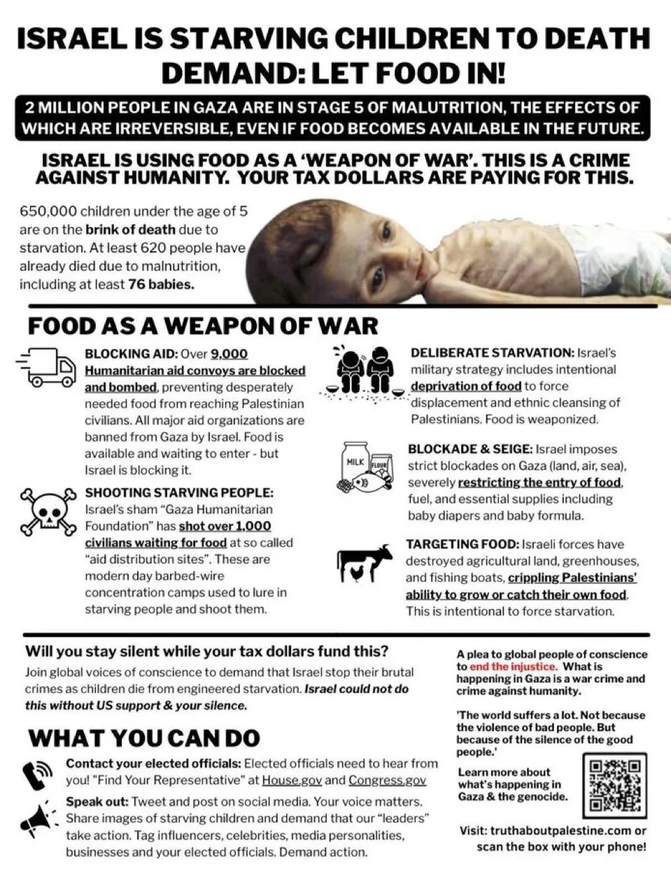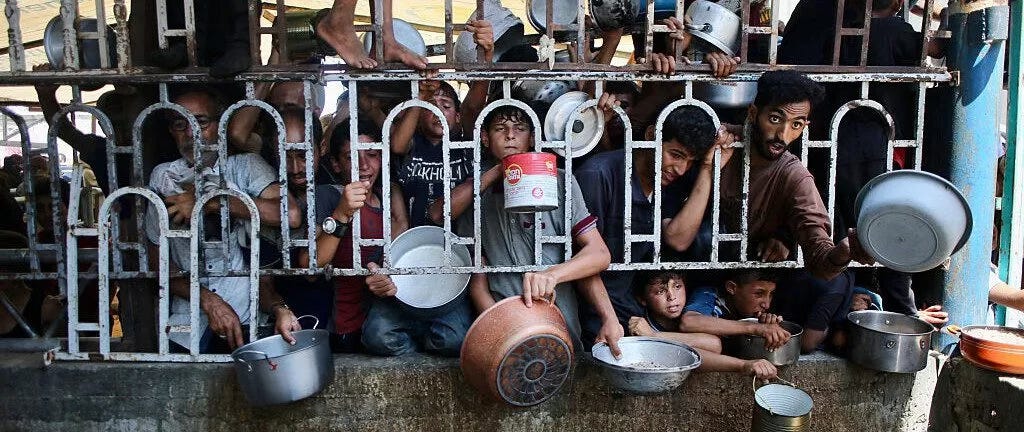 Au 25 juillet 2025, plus de 85 % de la population de Gaza a atteint le stade 5 de la famine, le dernier avant la mort. Plus de 1,8 million de personnes meurent donc de faim en temps réel. Selon l'Organisation mondiale de la santé (OMS) et les Nations unies, c’est l'une des famines les plus meurtrières de l'histoire moderne causée par l'homme. Les médecins ont rapporté que l’expression “la peau sur les os” ne suffisent plus à décrire la situation. Des nourrissons meurent sous les yeux de leur mère, et il n'y a pas de lait maternisé pour les nourrir. Les travailleurs humanitaires décrivent des enfants au regard vide, dont les organes commencent à lâcher.