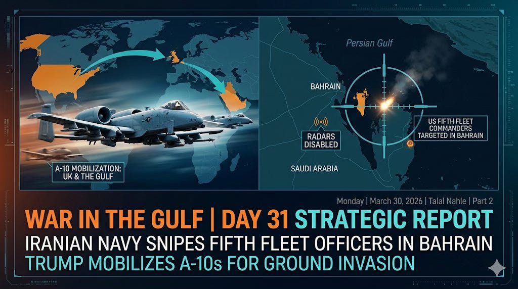La marine iranienne Ă©limine des officiers de la CinquiĂšme Flotte Ă BahreĂŻn⊠et Trump mobilise des A-10 en prĂ©vision dâune invasion terrestre. â Talal Nahle