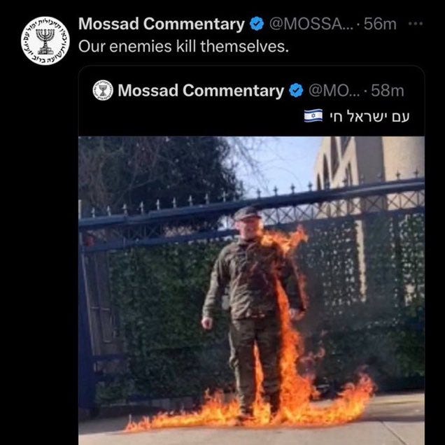 Le Mossad, l'agence de renseignement extérieure israélienne s'est moqué de la mort du soldat américain Aaron Bushnell alors qu'il s’immolait en criant “Palestine libre” devant l'ambassade israélienne à Washington.