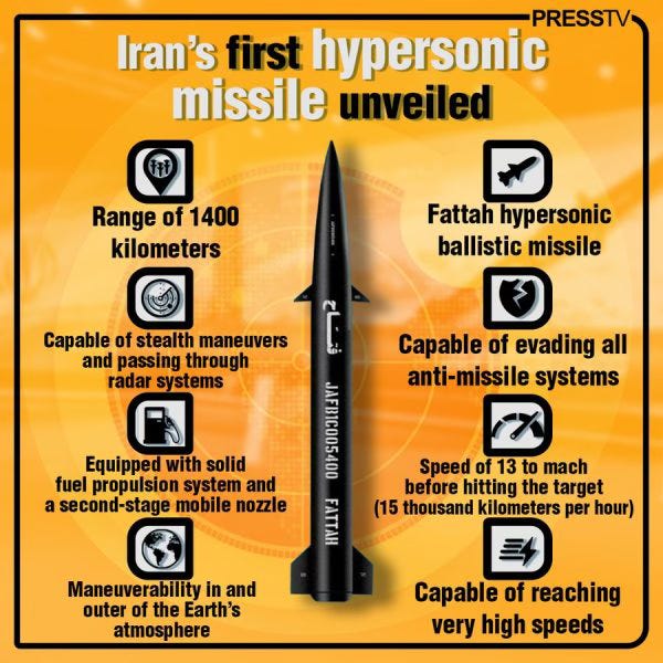 âEn d'autres termes, la prĂ©sence du Fattah-1 devrait inciter les AmĂ©ricains et les IsraĂ©liens Ă rĂ©flĂ©chir Ă deux fois avant de lancer des frappes aĂ©riennes prĂ©ventives contre des installations iraniennes soupçonnĂ©es de dĂ©velopper des armes nuclĂ©airesâ. Why Iranâs Fattah-1 Hypersonic Missile Is a Disaster for Israeli Security, National Interest