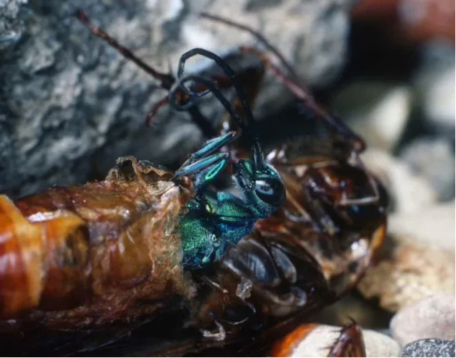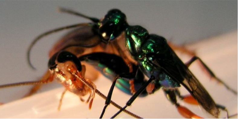 La guêpe joyau (Ampulex compressa) est ce qu'on appelle un parasitoïde, un organisme qui, contrairement aux parasites plus conventionnels, finit par tuer son hôte, le cafard américain (Periplaneta americana).