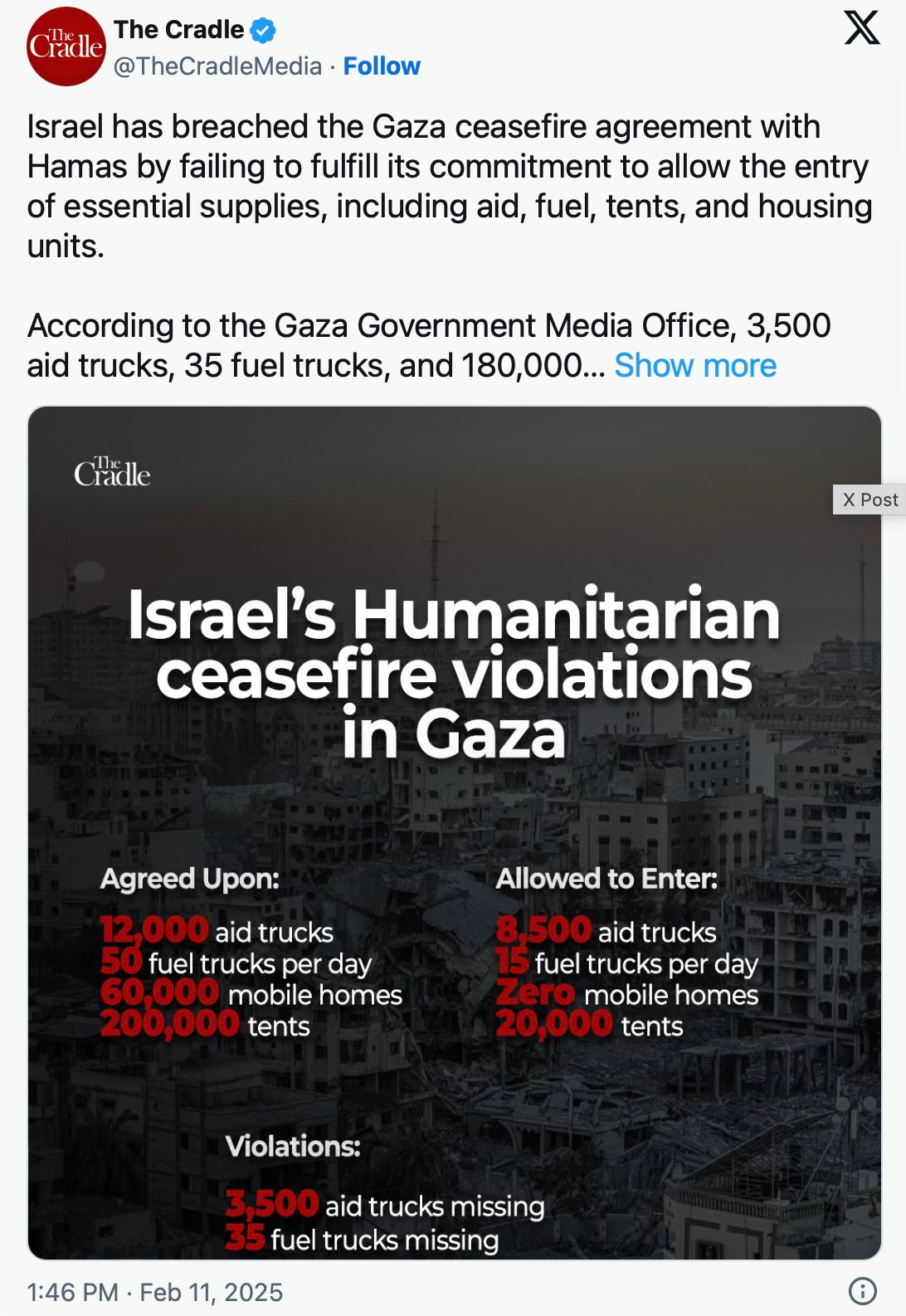 a rapporté la chaßne de télévision israélienne Kan le 13 février. La Kan a déclaré par la suite que les camions n'étaient pas encore entrés et qu'ils attendaient l'autorisation et l'inspection israéliennes.