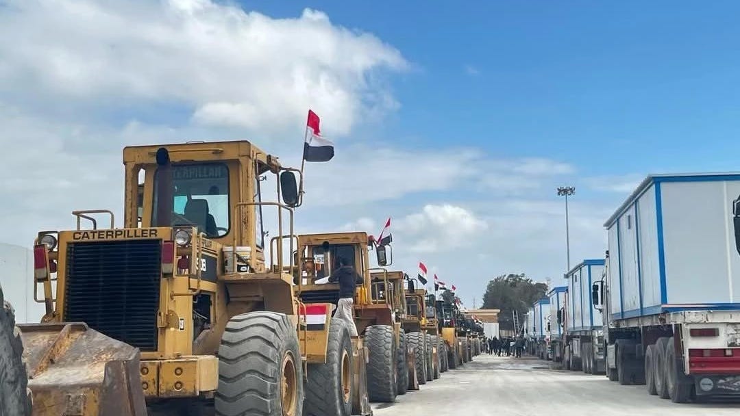 Des bulldozers battant pavillon Ă©gyptien et des camions transportant du matĂ©riel lourd et des maisons mobiles ont Ă©tĂ© vus alignĂ©s cĂŽtĂ© Ă©gyptien du checkpoint de Rafah, prĂȘts Ă entrer dans la bande de Gaza.