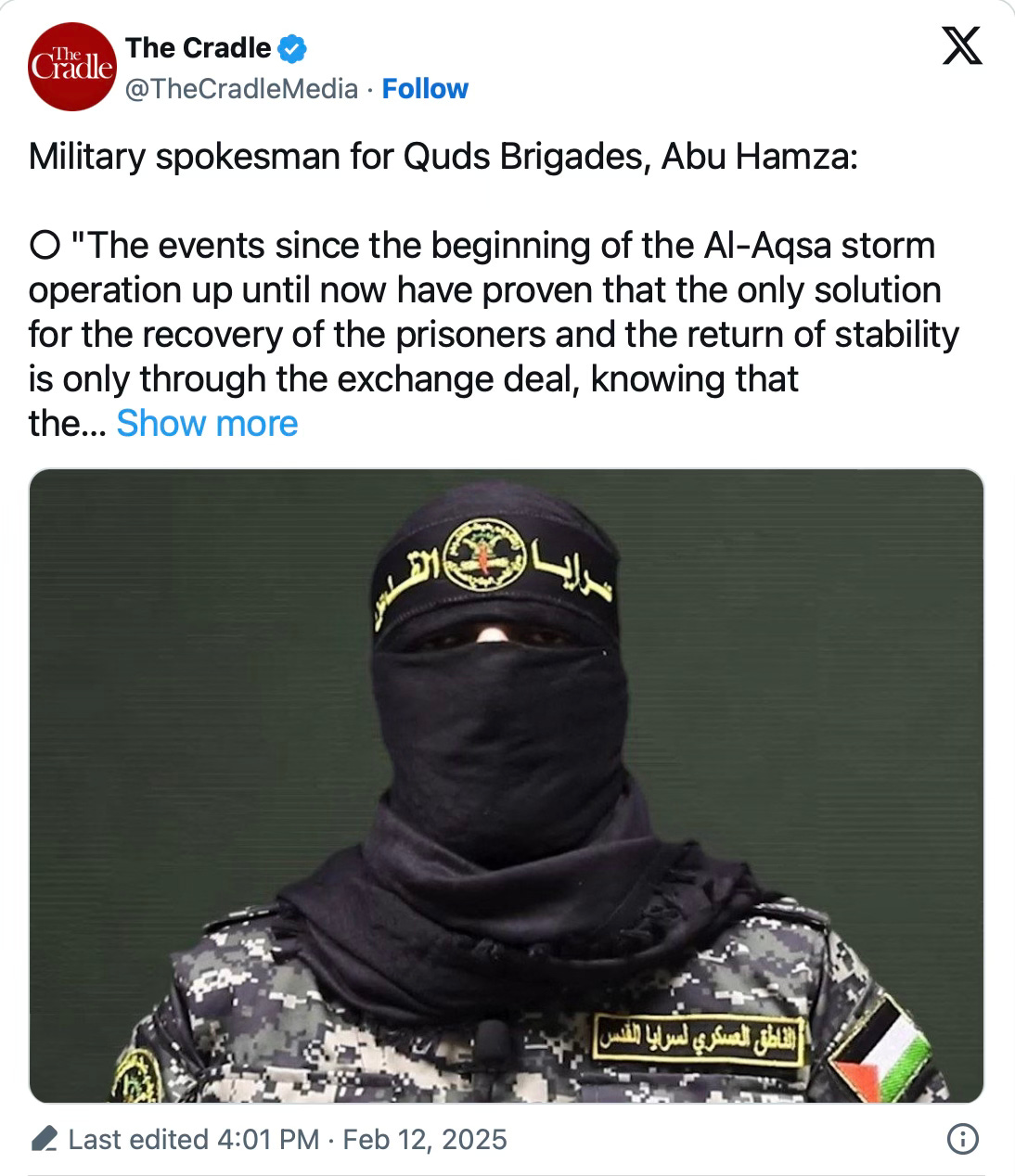 Le 12 fĂ©vrier, le porte-parole des Brigades Al-Qods, la branche armĂ©e du Jihad islamique palestinien (JIP), a averti que le sort des prisonniers israĂ©liens Ă Gaza âest entre les mains de Netanyahuâ, soulignant que seul un Ă©change de prisonniers peut rĂ©soudre la crise.