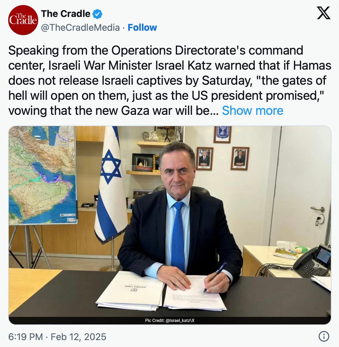 La dĂ©claration de Netanyahu est intervenue aprĂšs que le prĂ©sident amĂ©ricain Donald Trump a averti le 10 fĂ©vrier que âtout serait remis en questionâ si les IsraĂ©liens retenus en otage Ă Gaza ne sont pas tous libĂ©rĂ©s d'ici le week-end prochain, menaçant ouvertement de faire Ă©chouer l'accord de cessez-le-feu.