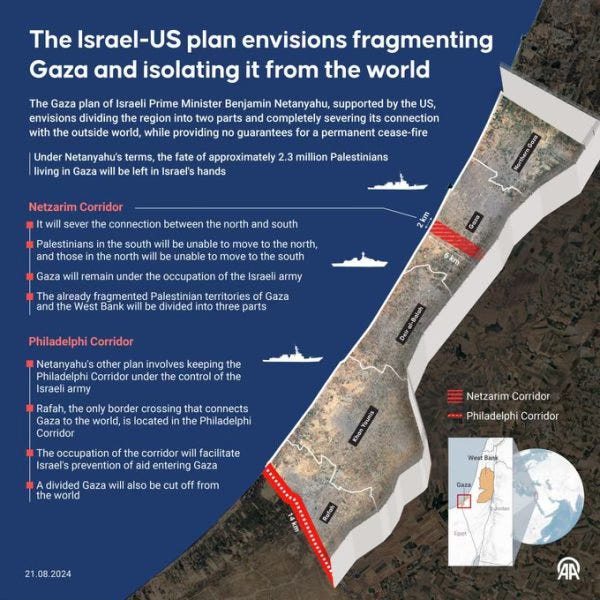 “Le discours public en Israël se concentre sur les otages et leur situation, mais Netanyahou les considère comme une nuisance médiatique, une arme de frappe pour ses opposants politiques et une distraction par rapport à l'objectif : une occupation prolongée de la bande de Gaza ou, comme il l'a déclaré à maintes reprises depuis le début de la guerre, le “contrôle de la sécurité israélienne” Le contrôle de la route Philadephi et du “corridor de sécurité” le long de la frontière permet à Israël d'encercler les frontières terrestres de Gaza et de l'isoler de l'Égypte. Le contrôle de la route de Netzarim divise en pratique le nord de Gaza, où il ne reste que quelques Palestiniens dont les maisons et les infrastructures ont été détruites, de la partie sud de l'enclave côtière, qui regorge de réfugiés venus de toute la bande de Gaza.