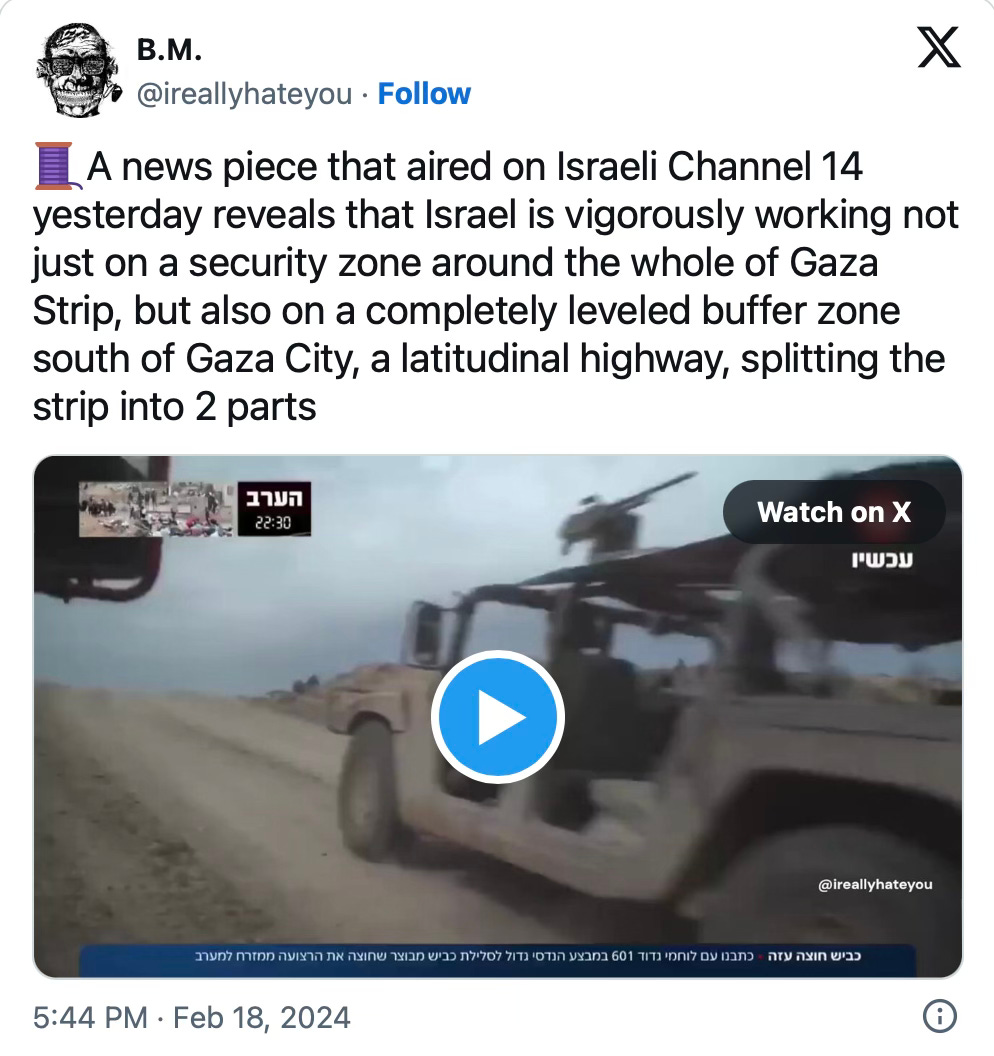 “Une image satellite du 6 mars révèle que la route est-ouest, en construction depuis des semaines, s'étend désormais de la zone frontalière entre Gaza et Israël à l'ensemble de la bande d'environ 6,5 kilomètres de large qui sépare le nord de Gaza, y compris la ville de Gaza, du sud de l'enclave…..”