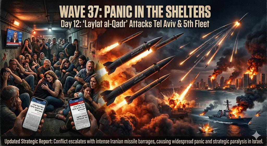 Dans les premiĂšres minutes du douziĂšme jour, les avertissements iraniens se sont muĂ©s en vĂ©ritable enfer. Les dirigeants iraniens ont choisi leur nuit la plus sacrĂ©e et la plus spirituelle (la nuit du martyre de lâimam Ali / Laylat al-Qadr) pour ouvrir les portes du paradis avec la 37Ăš vague de lâopĂ©ration True Promise. Le timing, synchronisĂ© et mĂ©ticuleusement planifiĂ©, Ă©tait conçu pour crĂ©er un Ă©tat de terreur et de paralysie totale.