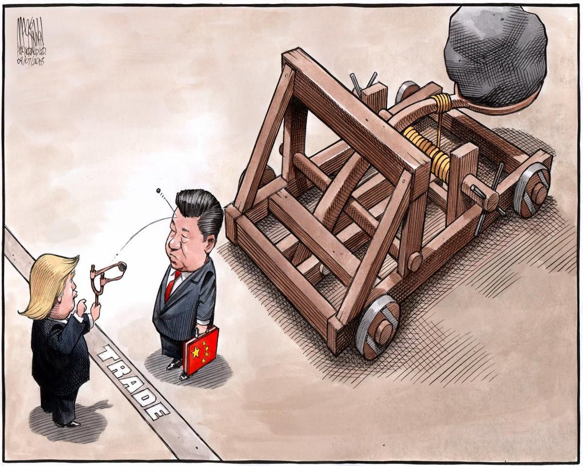 Un piĂšge rudimentaire. Avec la Chine comme seul objectif. Ce qui est sans rapport avec le complot initial : des droits de douane, Ă la mafieuse, sur la majeure partie de la planĂšte, y compris les Ătats-Unis. Si vous ne ripostez pas, tant mieux. Si vous le faites, nous frapperons plus fort.