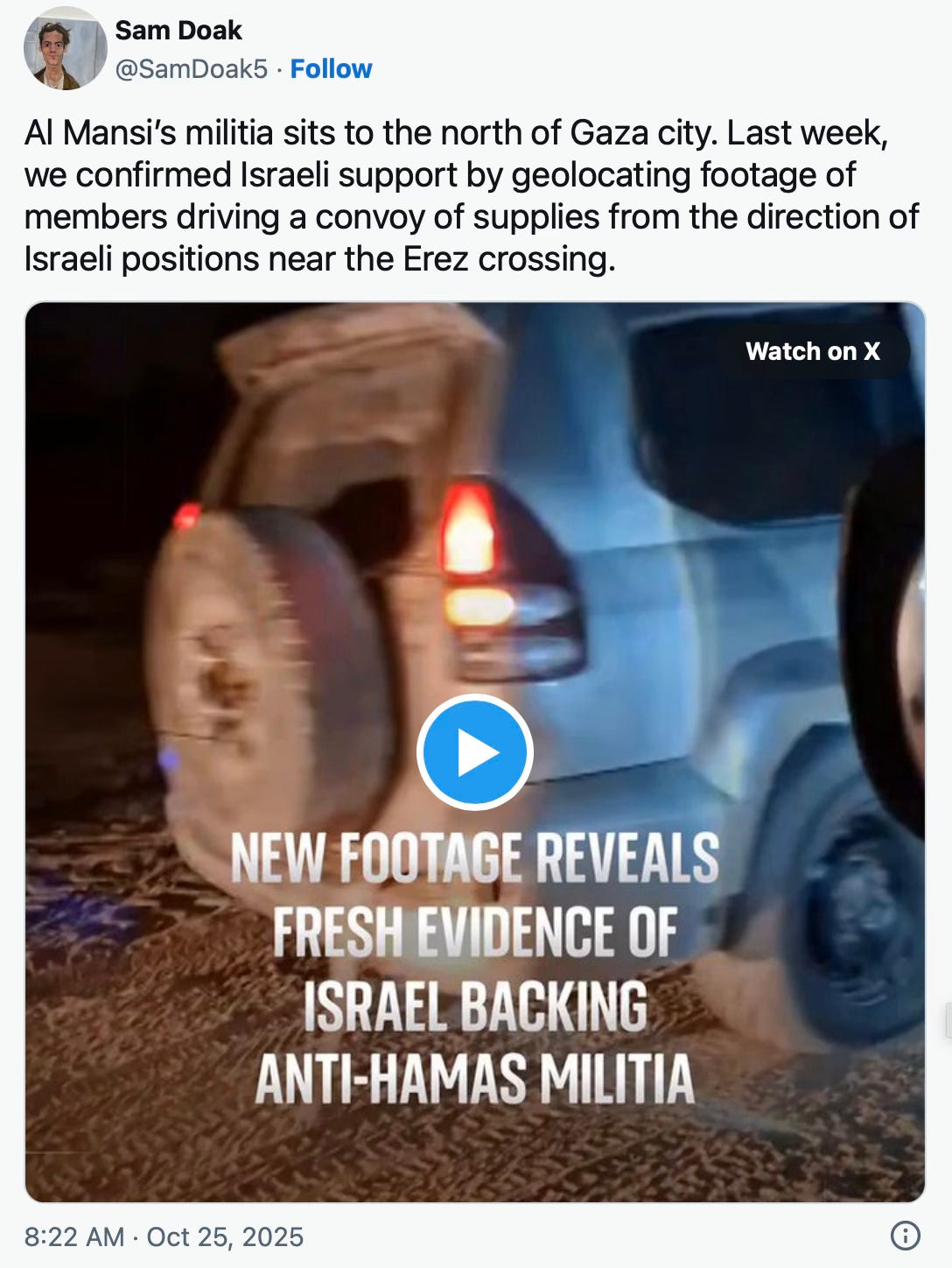 Selon un rapport publiĂ© par Sky News le 25 octobre, IsraĂ«l soutient quatre milices, dans le cadre dâun projet destinĂ© Ă renverser le Hamas et Ă crĂ©er une ânouvelle Gazaâ.