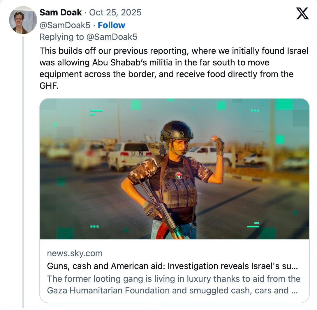Ce mĂȘme poste-frontiĂšre est Ă©galement utilisĂ© par Yasser Abu Shabab, un trafiquant de drogue et contrebandier liĂ© Ă Daech, qui dirige sa propre milice anti-Hamas avec le soutien dâIsraĂ«l.