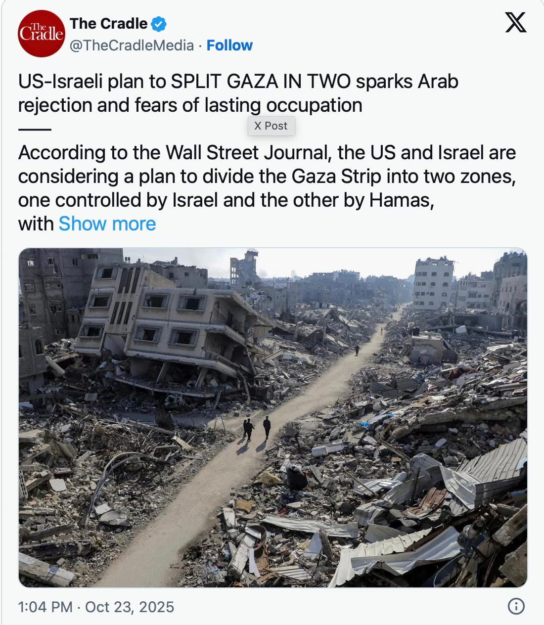 Dâautres rapports indiquent par ailleurs que les Arabes ne sont pas disposĂ©s Ă dĂ©marrer la reconstruction dans les zones encore contrĂŽlĂ©es par le Hamas. Ce plan sâinscrit, selon le Wall Street Journal, dans une stratĂ©gie plus large des Ătats-Unis et dâIsraĂ«l pour diviser Gaza. Selon ces informations, la proposition prĂ©voit de diviser lâenclave en deux zones, lâune sous contrĂŽle israĂ©lien et lâautre sous contrĂŽle du Hamas. La reconstruction ne concernerait que la zone contrĂŽlĂ©e par IsraĂ«l, jusquâĂ ce que le Hamas soit dĂ©sarmĂ© et Ă©vincĂ©, permettant ainsi de crĂ©er une ânouvelle Gazaâ sous la surveillance permanente dâIsraĂ«l.