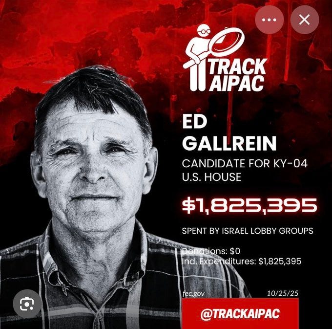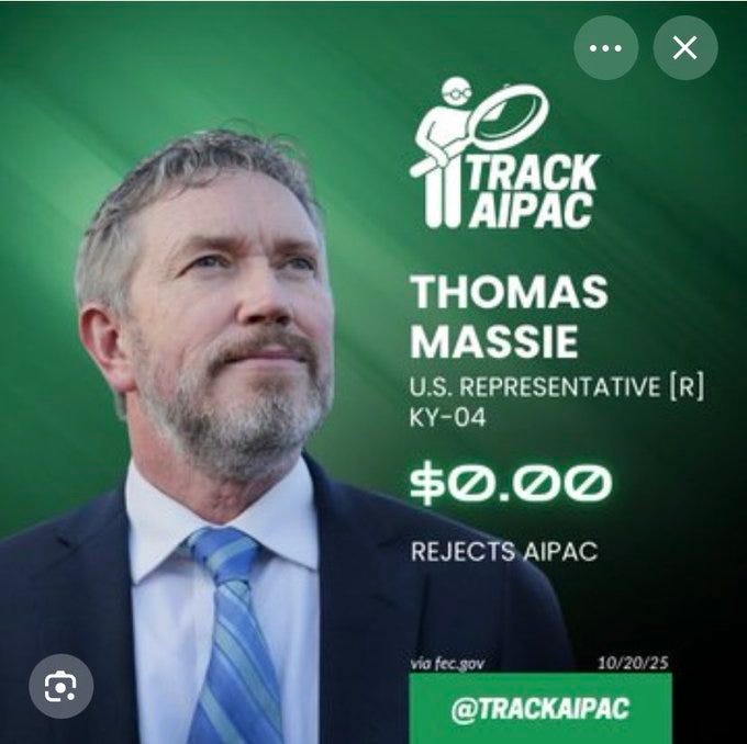Un super PAC associĂ© au prĂ©sident Trump, ainsi que Miriam Adelson et dâautres mĂ©ga-donateurs super-sionistes, ont dĂ©jĂ rĂ©coltĂ© des millions de dollars pour dĂ©trĂŽner Massie via son concurrent, Ed Gallrein, qui pourrait, je dis bien pourrait, briguer le siĂšge au SĂ©nat actuellement occupĂ© par Mitch McConnell, qui prend (heureusement) sa retraite.