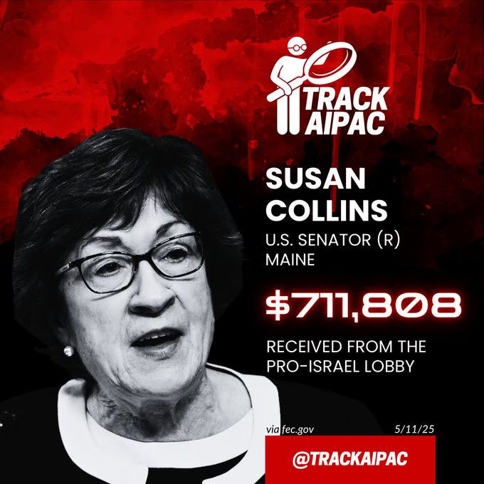 Parmi mes favoris figure Graham Platner, ostréiculteur à Frenchman Bay, sur la cÎte du Maine. Il se présente explicitement comme antisioniste et brigue le siÚge au Sénat longtemps occupé par Susan Collins, qui aurait reçu environ 650 000 dollars de la part de lobbies israéliens, selon un article bien documenté publié dans The Palestine Chronicle.
