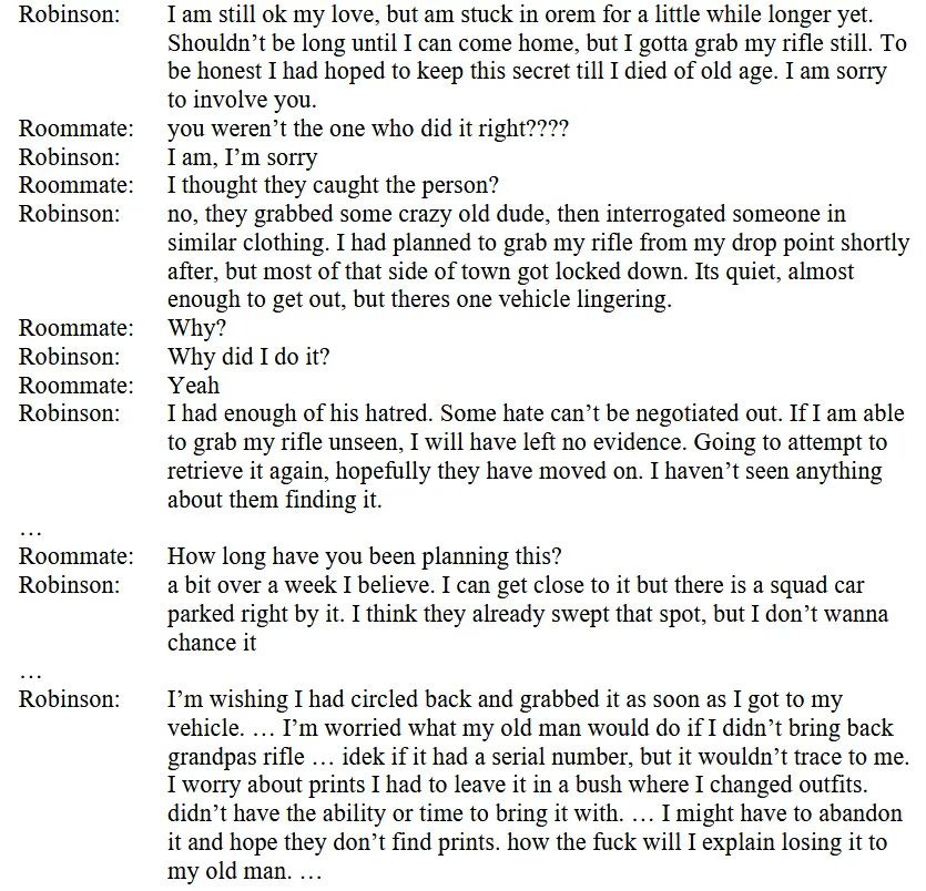 Ces Ă©changes, contenus dans un acte dâaccusation contre Robinson accessible au public, ont fait lâobjet de nombreuses allĂ©gations de falsification et de moqueries. Ces textes ne sont pas datĂ©s et semblent incongruement auto-incriminants pour un tireur ayant pris des mesures significatives pour dissimuler ses traces, au point que ces communications constitueraient un dossier accablant contre Robinson aux yeux des autoritĂ©s. Robinson est Ă©galement citĂ© utilisant des termes tels que âvoiture de patrouilleâ et âsite de dĂ©pĂŽtâ, des expressions quâun militant de gauche de 22 ans est trĂšs peu susceptible dâemployer.