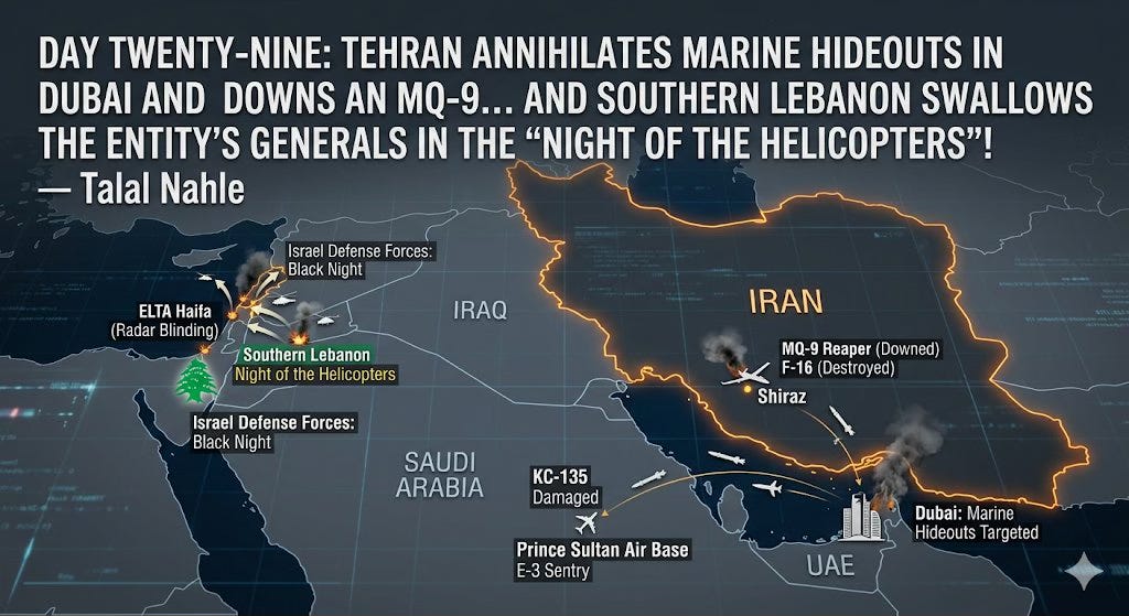TĂ©hĂ©ran frappe les hĂŽtels oĂč se cachent les Marines Ă DubaĂŻ et abat un MQ-9⊠tandis quâau Sud-Liban, des officiers et soldats israĂ©liens sont Ă©vacuĂ©s lors de la âNuit des hĂ©licoptĂšresâ. â Talal Nahle